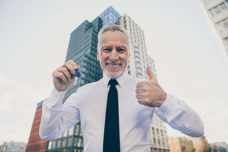 Low angle view photo of charming grey haired realtor man make thumb up hold keys in city center outside building.