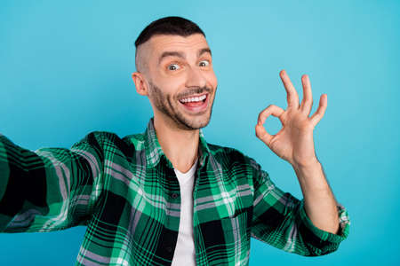 Photo of cheerful happy young man show okay sign make selfie smile approve isolated on blue color background