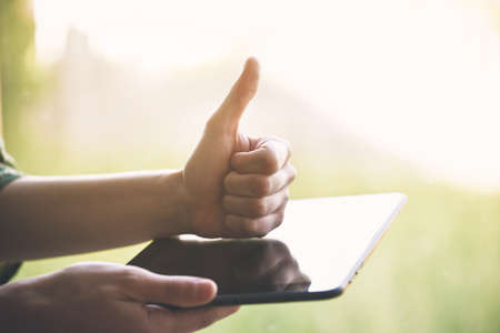 Thumb up, like. Close up female hands holding tablet with blank screen during online watching of popular sport matches, championships. Copyspace for ad. Devices, gadgets, technologies concept.