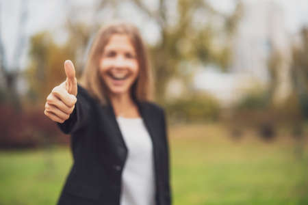 Young girl puts her big thumbs up. Portrait of cheerful kid. Smiling girl having fun outside. Happy successful person.