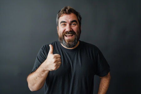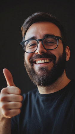 A man with a beard is smiling and giving a thumbs up. He is wearing a black shirt and he is happy