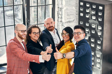 Group of happy smiling confident young multiracial business men and women giving thumbs-up together, closeup. Excellent choice, good result, success, winning solution, office job satisfaction concept