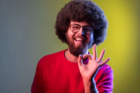 Happy smiling hipster man with Afro hairstyle showing okay sign, looking at camera with positive expression, wearing red sweatshirt. Indoor studio shot isolated on colorful neon light background.