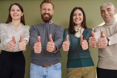 Happy business team. Group of cheerful business people in casual wear standing close to each other and showing their thumbs up