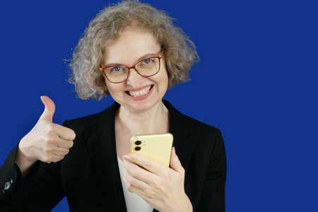 business woman in suit using yellow mobile phone on blue chromakey background, small business entrepreneur looking at her mobile phone, closeup