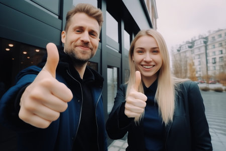 Portrait happy Caucasian successful smiling couple showing thumbs up looking at camera outside. Business people office optimistic family buy house insurance investing property mortgage rent apartment