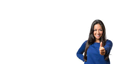 Cheerful beautiful young woman looking at camera while showing thumb up or like sign against white studio background for copy space
