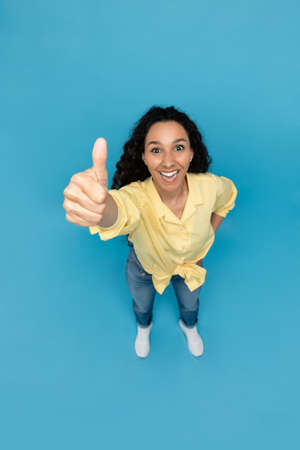 Happy young woman showing thumb up gesture, approving or recommending something on blue background, above view