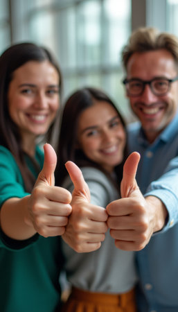 This vibrant image captures three friends—two women and one man—enthusiastically giving thumbs up in a contemporary office setting. Their joyful expressions and the warm, inviting atmosphere convey a sense of camaraderie and positivity, perfect for showcasing teamwork and success.