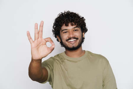Young bearded man smiling while showing ok gesture isolated over white background