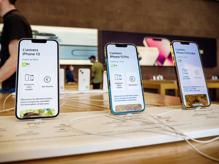 Paris, France - Mar 19 2019: Man POV personal perspective holding iPhone XS inside the new Apple Store Champs-Elysees - showing prices in Euros - French flagship store