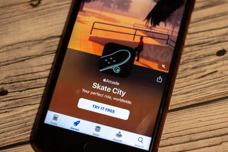 Saint-Petersburg, Russia - 10 January 2020: Skate City icon close up on phone screen. Arcade games on app store, Illustrative Editorial.