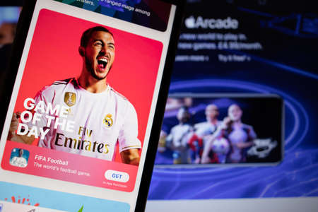 Saint-Petersburg, Russia - 10 January 2020: Mobile phone with FIFA Football icon on screen close up with website on laptop, Illustrative Editorial.