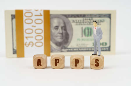 business and finance concept. On a white surface are cubes with the inscription - APPS. On the cube is a figure of a man, in the background there are dollars