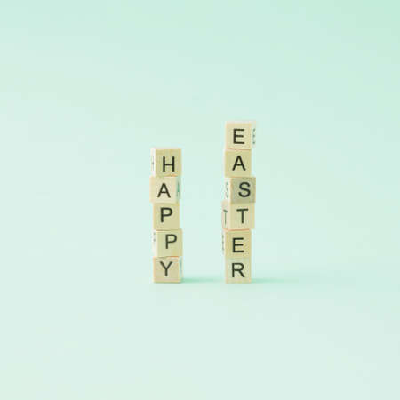 The inscription Happy Easter on wooden cubes on a pastel green background. Minimal concept.