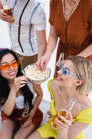 joyful multicultural friends drinking beer and eating popcorn during summer party