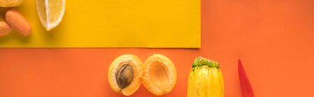 top view of yellow fruits and vegetables on orange background with copy space, panoramic shot