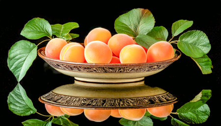 Juicy, sun-ripened apricots nestled in an intricate ceramic dish, accented by lush green leaves, set against an elegant dark background to evoke fresh
