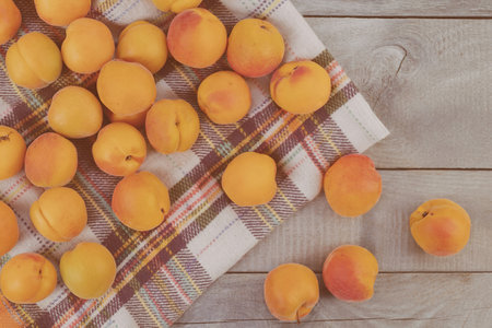 top view of pattern of apricots on plaid cloth and on wooden background