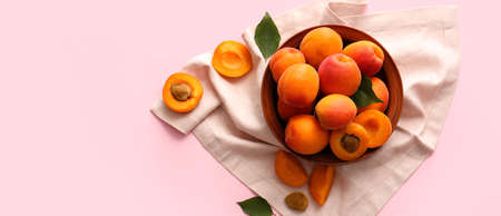 Bowl with tasty ripe apricots on pink background with space for text, top view