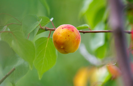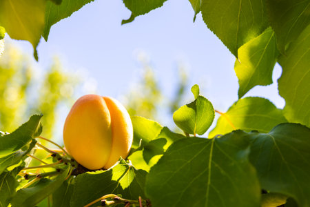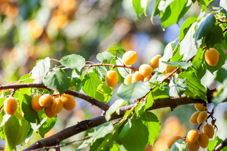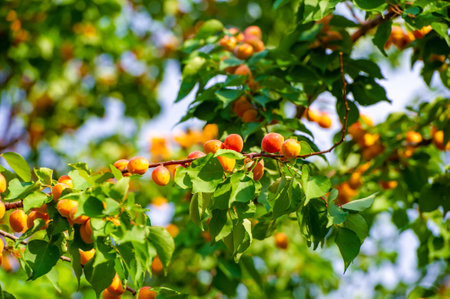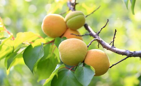 Organic ripe apricots hanging on tree branch, fresh summer fruit ready for harvest in garden orchard