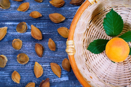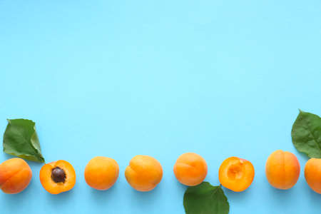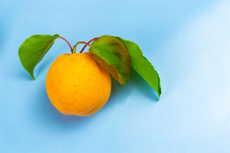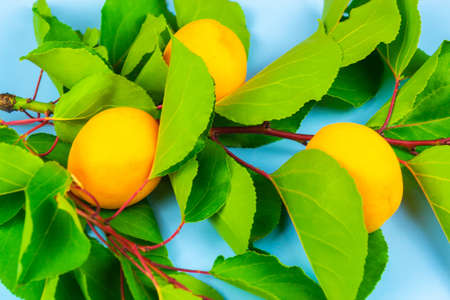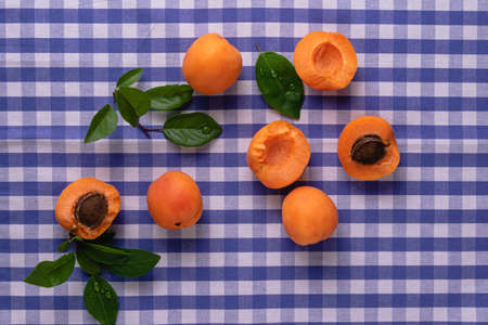 Ripe apricot fruits and leaves are scattered on white and blue checkered tissue. Natural organic fruits