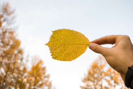 Hand holds yellow autumn leaf on sky background. Autumn time season composition in park.