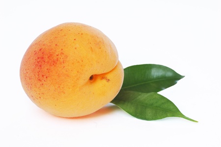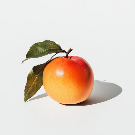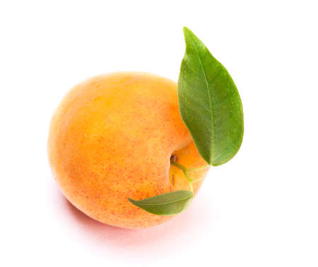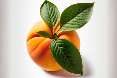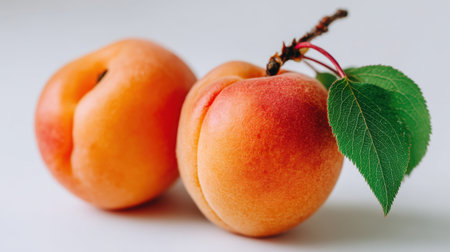 Two ripe apricots with rich color and fresh green leaves showcase natural beauty on a clean white background, highlighting freshness.