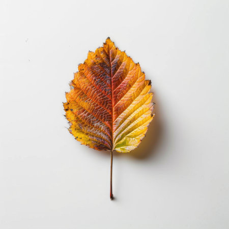 A stunning autumn leaf showcasing a beautiful gradient of orange, yellow, and brown colors rests on a pristine white surface. Perfect for nature-themed projects.