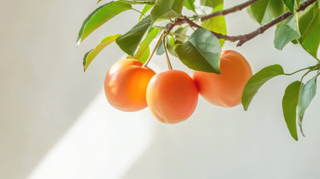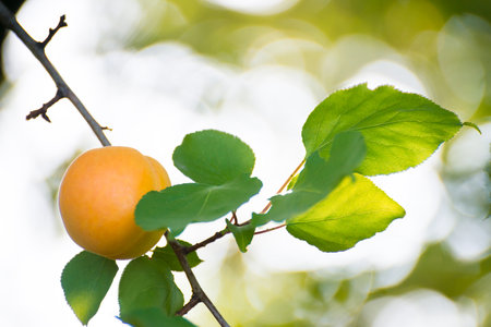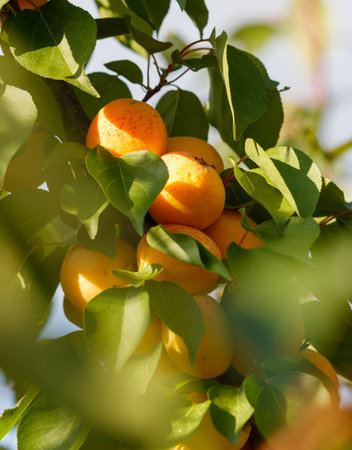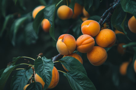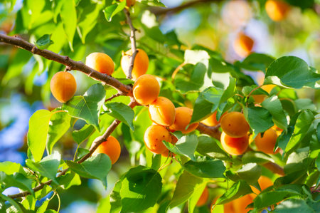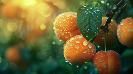 Ripe apricots on tree branch against lush garden background, ideal for food and nature themes