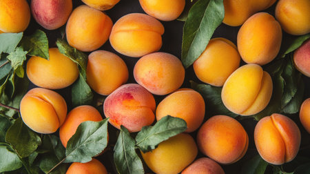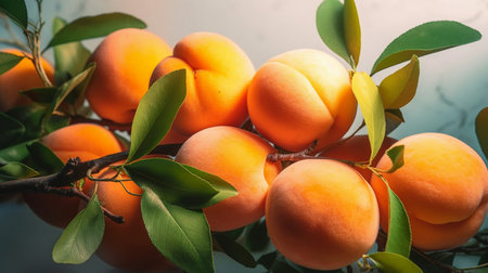 Juicy apricots with green leaves still attached, freshly picked and full of natural sweetness.