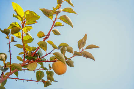 A branch with unripe persimmon fruits in the garden against the blue sky in the background light