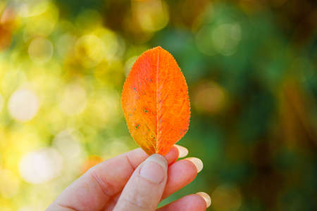 Closeup natural autumn fall view woman hands holding red orange leaf on dark park background. Inspirational nature october or september wallpaper. Change of seasons concept