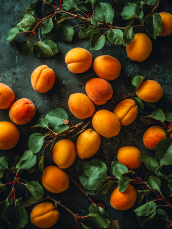 Vibrant apricots nestled among lush green leaves create a striking contrast on a deep, moody surface, evoking freshness and natural elegance.