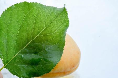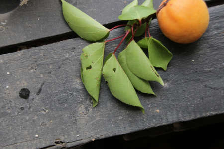 Close-up of ripe peaches on the table. Ripe peaches with leaves