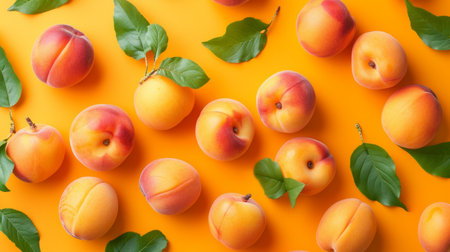 Fresh Apricots Pattern, Vibrant Orange Fruits with Leaves on Yellow Background, Summer Food Concept