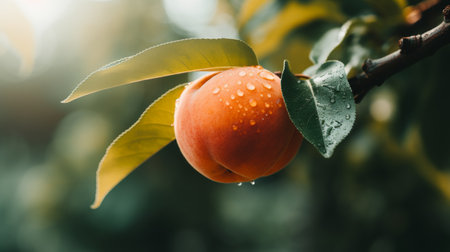 Close up view of a ripe peach hanging on a tree branch with a vibrant garden background