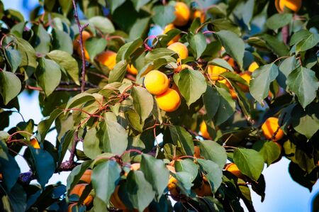 many apricot fruits on a tree in the garden on a bright summer day. Organic fruits. Healthy food. Ripe apricots.