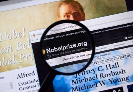 MONTREAL, CANADA - OCTOBER 2, 2017: Nobel Prize web page under magnifying glass. Nobelprize.org is the official web site of the Nobel Prize.