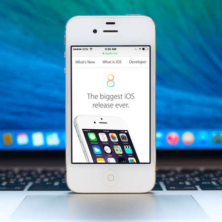 SIMFEROPOL, RUSSIA - NOVEMBER 01, 2014: Apple iPhone stay over Macbook and presenting information of iOS 8. iOS 8 is the eighth major release of the iOS mobile operating system designed by Apple Inc.
