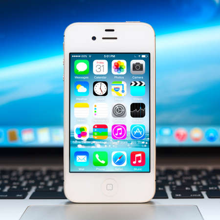 SIMFEROPOL, RUSSIA - NOVEMBER 01, 2014: Apple iPhone stay over Macbook and displaying iOS 8.1 homescreen. iOS 8 is the eighth major release of the iOS mobile operating system designed by Apple Inc.
