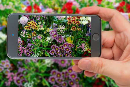 Beautiful decorative colorful plants. Floral background. Photo smartphone. Smartphone in hand. Flowers on the screen.
