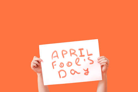 Hands holding poster on color background. April Fools Day celebration