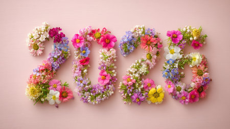 Colorful floral composition depicting the year 2026, perfect for celebratory occasions and artistic displays. Bright flowers arranged on a soft pink background create a joyful scene.