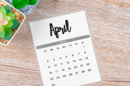 April 2023 Monthly calendar for 2023 year on wooden background.
