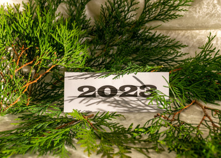 2023 golden numbers on green composition with moss, fern and glitter. Studio photography of a new year background.