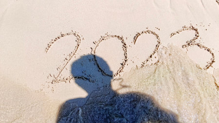 The year 2023- handwriting on sand beach, Happy New Year coming concept. White waves are lapping toward the shore.