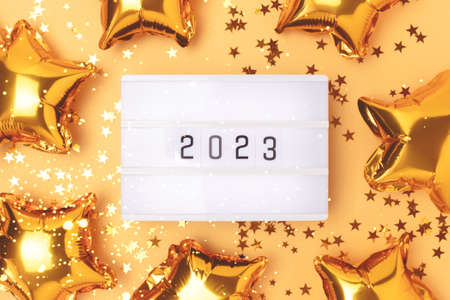 Lightbox with 2023 numbers on a gold colored background. Frame made of stars confetti and foil balloons.