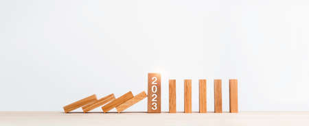 The 2023 year numbers calendar on wooden cube blocks stops falling blocks and collapsing dominoes on table isolated on white background. Preventing the domino effect and staying strong concept banner.