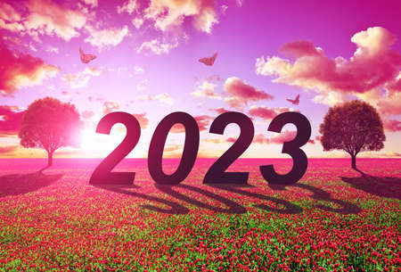 Number 2023 with tree in the meadow at sunset. Concept of Happy New Year.